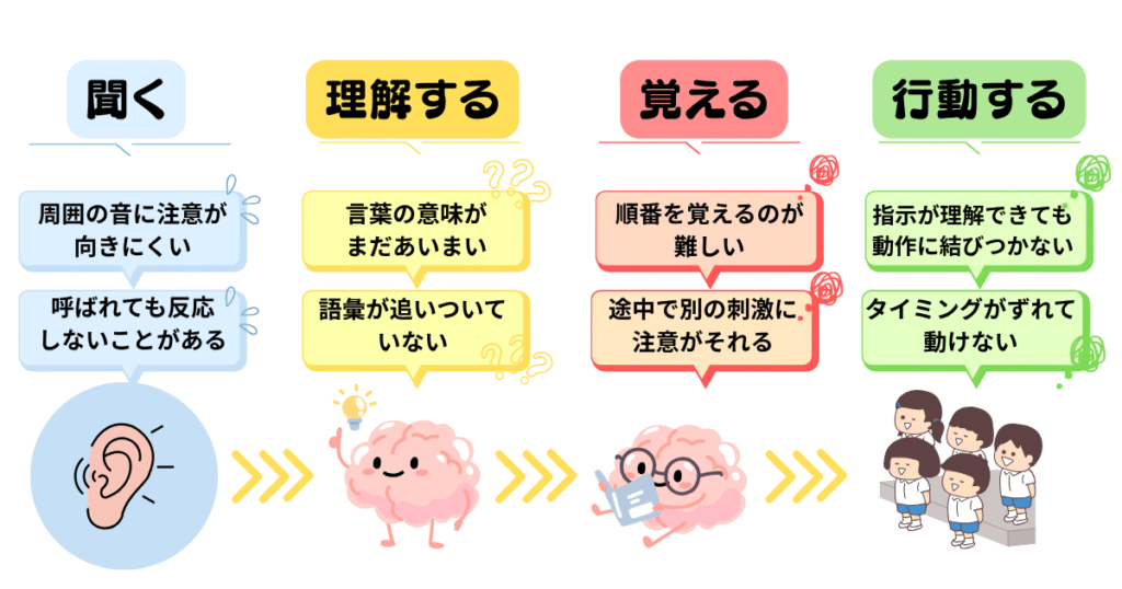 「言葉はわかってるはずなのに、なんで通らないの?」と感じることもあるかもしれません。でも実は、一斉指示には言葉の理解以外にも、たくさんのハードルがあるんです。