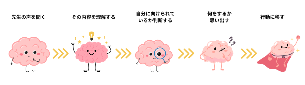 一斉指示は「みんなに向けて」言われるので、子ども側としては以下の処理を同時に行う必要があります。